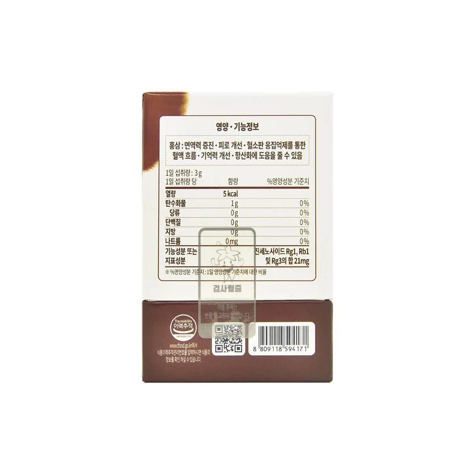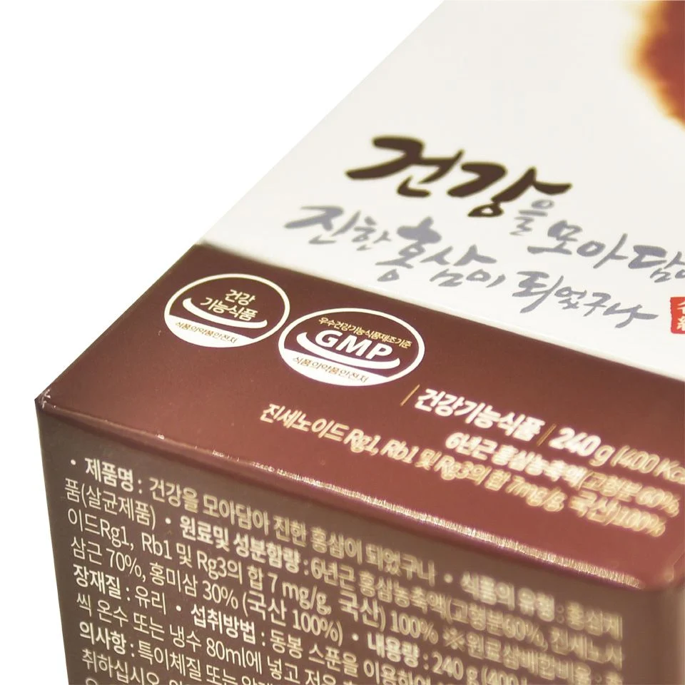 Cao hồng sâm được chiết xuất 100% từ hồng sâm Hàn Quốc 6 năm tuổi nên có chứa tất cả các saponin, vitamin, khoáng chất của hồng sâm. Nên có công dụng cao trong bồi bổ sức khỏe của con người. (thành phần rắn 60%, hàm lượng ginsenoside Rg1, Rb1, Rg3 7mg/g) chiếm 100%. Tỉ lệ phối trộn rễ chính chiếm 70%, rễ phụ chiếm 30%