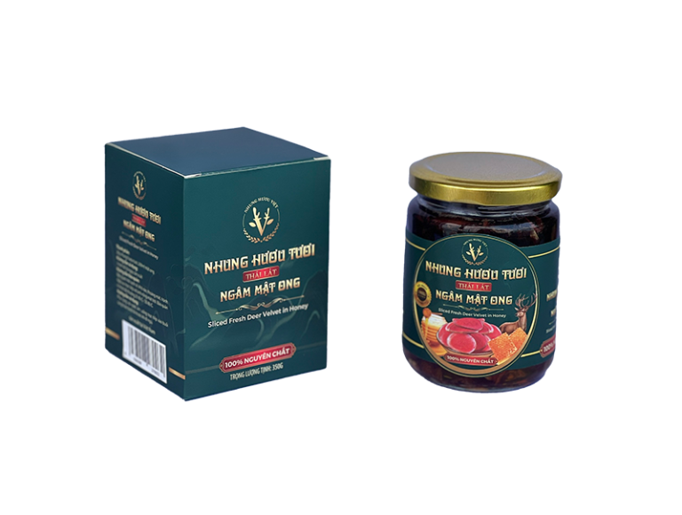 Lọ tròn: Trọng lượng tịnh 350 g có thành phần gồm: 20g nhung hươu tươi thái lát và 200ml mật ong.