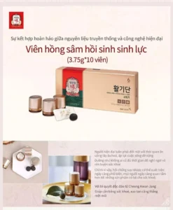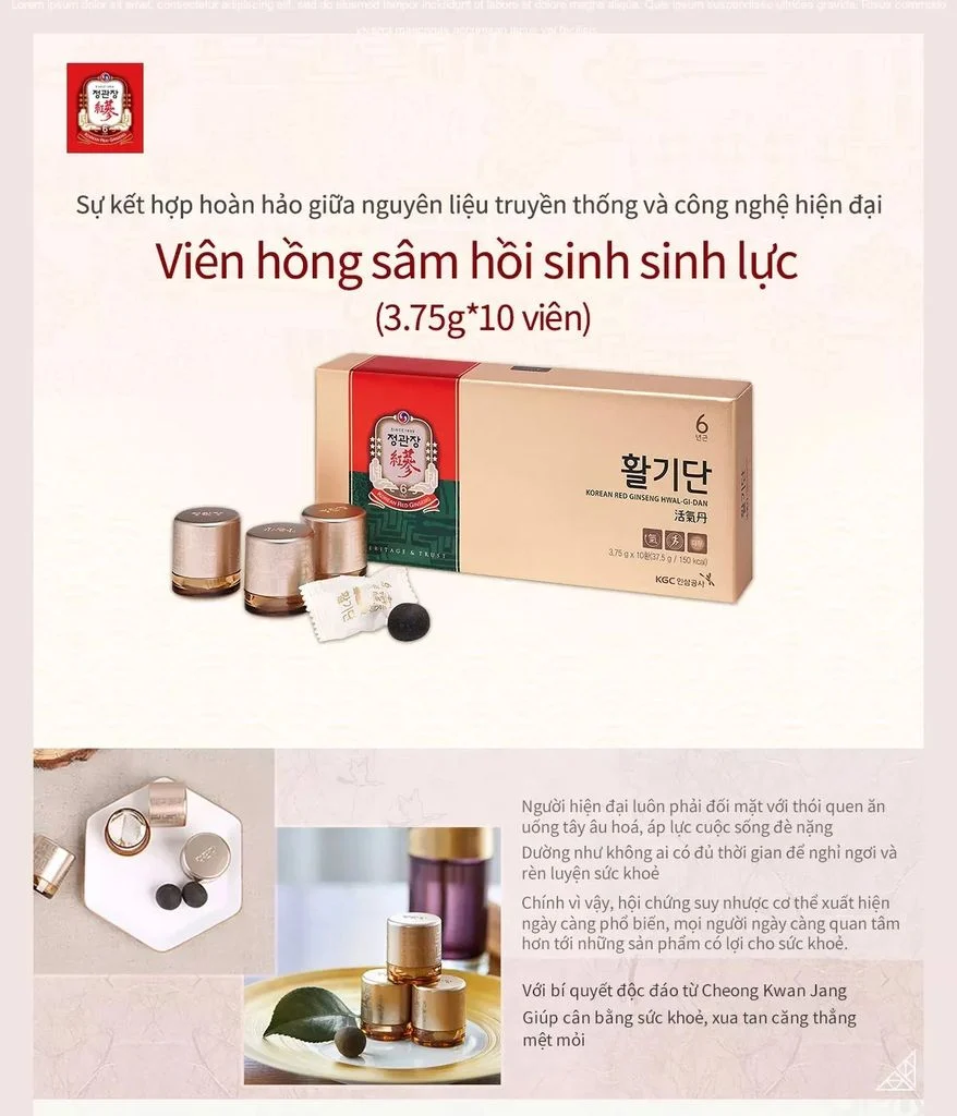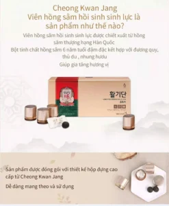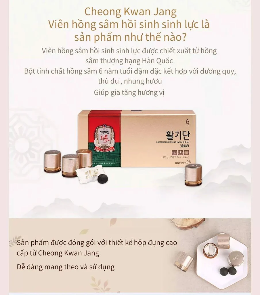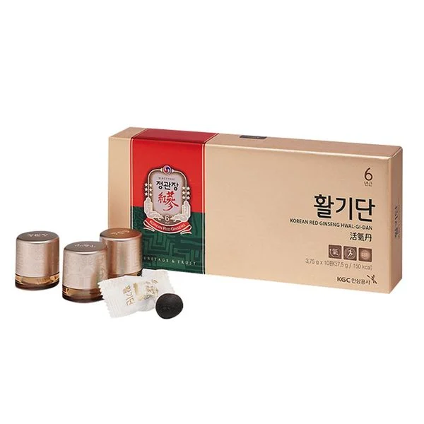 – Thành phần chính: Bột tinh chất chiết xuất Hồng sâm Hàn Quốc (6 năm tuổi, Ginsenoside 80mg/g) 15,3%, bột hồng sâm (6 năm tuổi, Ginsenoside 30mg/g) 5% hỗn hợp thảo dược độc quyền, Bạch thược, Lá tre, Phục linh, Câu kỷ tử , Đương quy Hàn Quốc, Táo đỏ, Gừng, Nhung hươu, Glycerine, Bột đậu nành, Sơn thù du