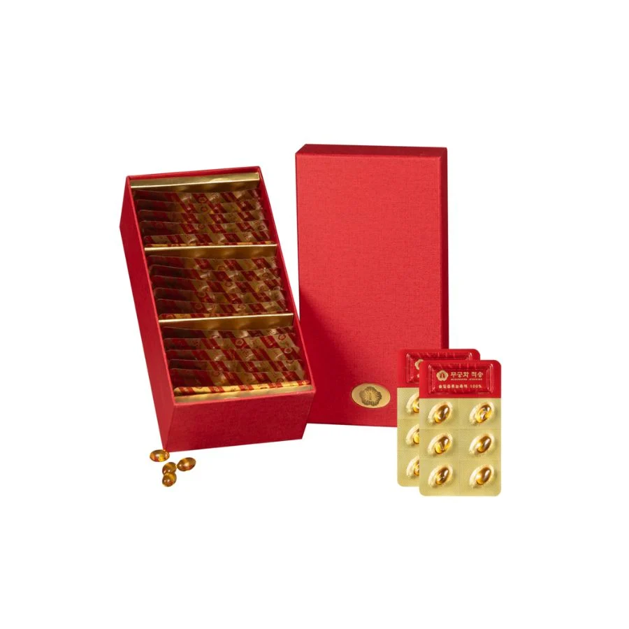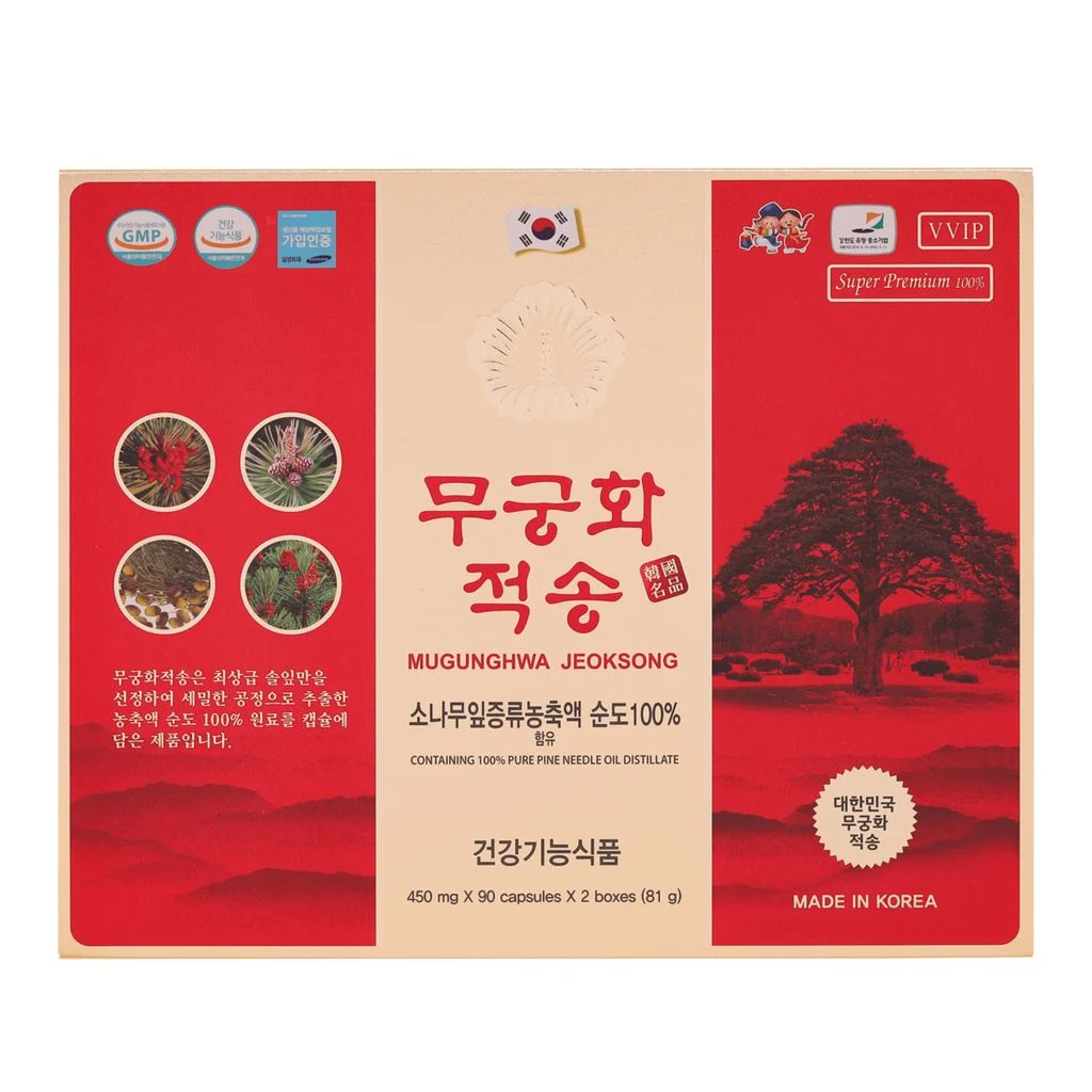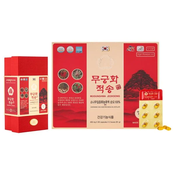 Chiết xuất 100% tinh dầu thông đỏ được ép từ 3 kg lá thông núi tại Hàn Quốc. Trong một viên tinh dầu thông đỏ có chứa tới hơn 5000 các loại hợp chất hữu cơ tự nhiên, cùng rất nhiều hoạt chất có tác dụng dược lý mạnh mẽ, chẳng hạn như tecpen, flavonoid và polyphenol, Các vitamin tan trong dầu như Vitamin A, E, K, acid amin, protein thiết yếu cho cơ thể.